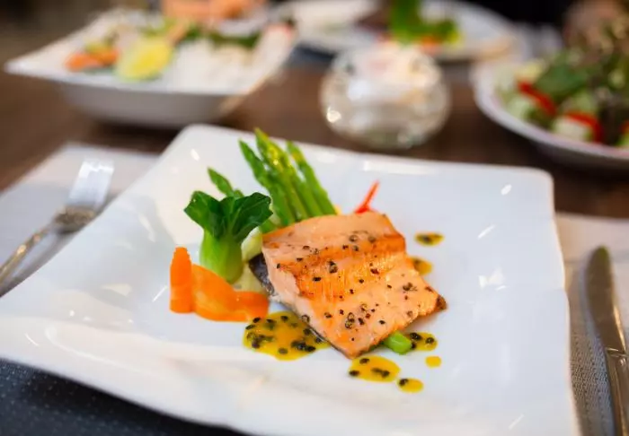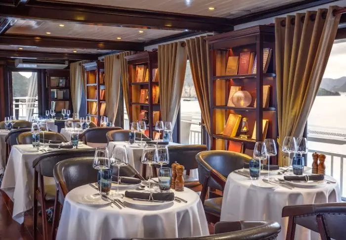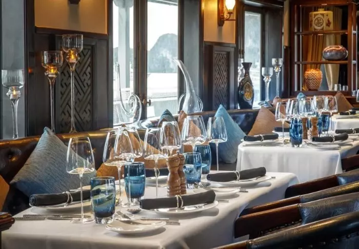 Im Restaurant des Schiffs können Sie die Aussicht genauso wie die leckeren Gerichte genießen. Serviert werden eine Mischung aus asiatischen und europäischen Gerichte, die abends von einer großen Auswahl an Weinen und Cocktails begleitet werden, während die Sonne hinter den beeindruckenden Kalksteinfelsen verschwindet.