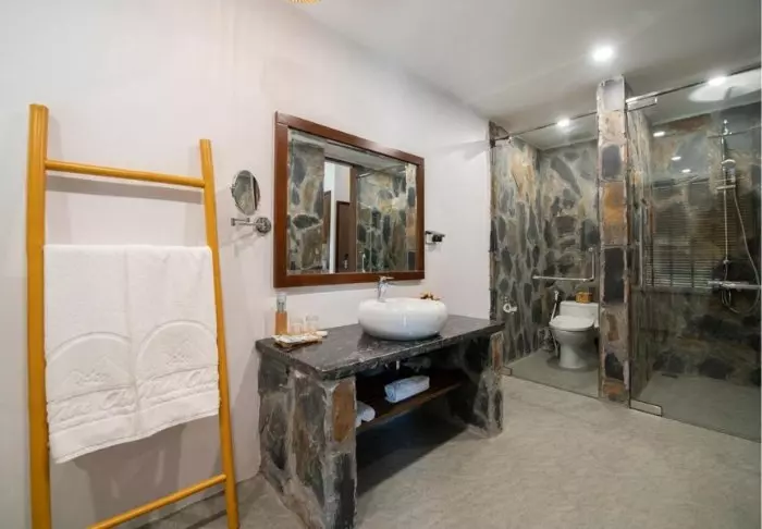 Die 26 Bungalows wurden aus Stein errichtet, sodass sie sich herrlich in die Umgebung am Berghang fügen. Alle Zimmer sind modern und minimalistisch eingerichtet, besonders Stein und Holz wurden für die Einrichtung verwendet. Die Farben sind dezent und passen zu den Kontrasten vor dem Fenster. Alle Zimmer verfügen über ein eigenes Bad/WC, ein TV-Gerät, eine Minibar, einen Föhn, eine Tee-/Kaffee-Ecke und Zugang zur Terrasse. Sowohl der Sonnenauf- als auch der Sonnenuntergang sind vom Hotel aus einfach magisch. Die Lodge bietet einen Pool und ein eigenes Restaurant.