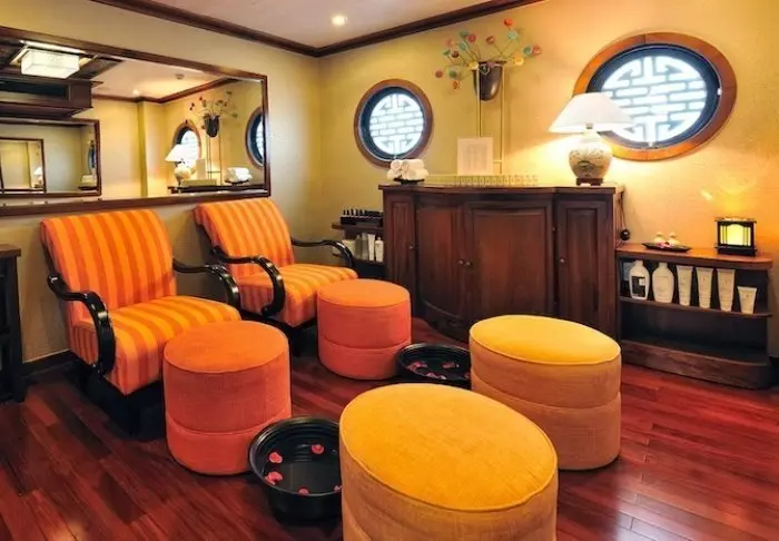 Direkt außerhalb der Kabine erwartet Sie das Sonnendeck mit Liegestühlen und Panoramablick auf die zahlreichen Felsformationen oder der Wellness-Bereich, in dem Sie Körper und Geist zur Ruhe kommen lassen können. Darüber hinaus bietet das Schiff Aktivitäten wie Kochkurse, Kajaktouren und Tai-Chi, sodass Sie Erholung und Erlebnisse optimal miteinander verbinden können.
