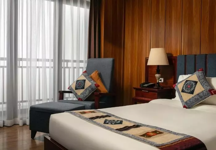 Die 104 Zimmer des Hotels sind geräumig und elegant, in traditionell-vietnamesischem Stil mit dunklen Holzmöbeln eingerichtet. Sie bieten alles, was man für einen komfortablen Aufenthalt so braucht: WLAN, Klimaanlage, Safe, TV-Gerät und eine Sitzecke. Im Badezimmer mit Dusche finden Sie kostenlose Toilettartikel, einen Föhn, Bademäntel und Hausschuhe. Die meisten Badezimmer sind außerdem mit einer großen Fensterfront ausgestattet, die eine malerische Aussicht auf die Landschaft von Sa Pa bietet.