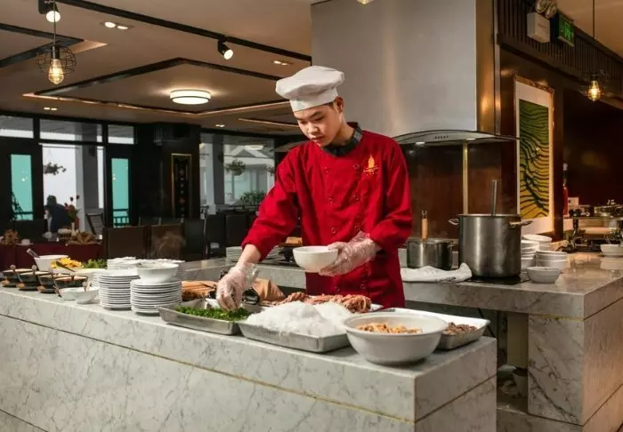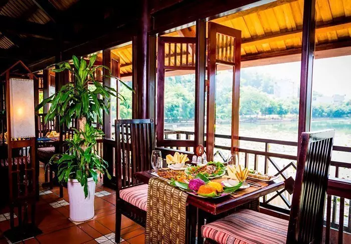 Im Bordrestaurant werden vietnamesische Speisen aus regionalen Zutaten mit exotischen Gewürzen angeboten. Die Holzeinrichtung des Speiseraums verbreitet eine angenehm romantische Atmosphäre.