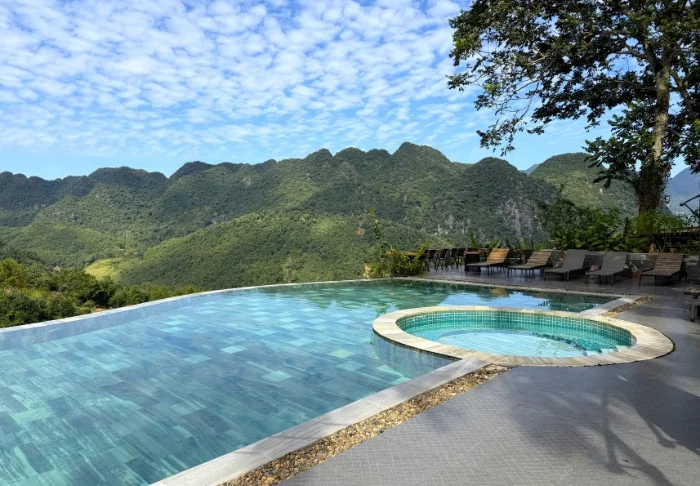 Nach einem erlebnisreichen Tag können Sie im Infinity-Pool mit Blick über das Tal eintauchen, auf einer Liege die Sonne genießen oder sich bei Sonnenuntergang hinter den Bergen an der Bar ein erfrischendes Getränk bestellen.