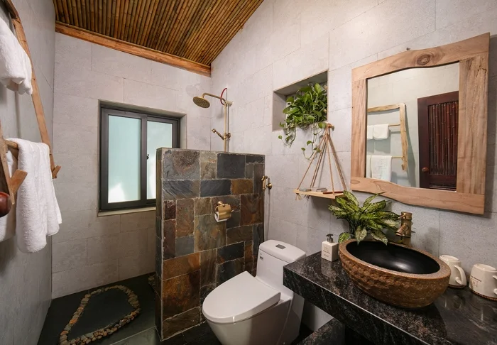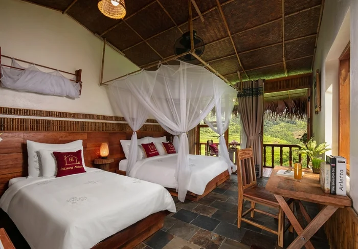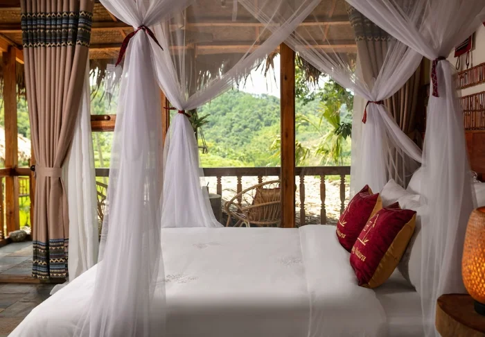 Sie übernachten standardmäßig in einem 32 m² großen Deluxe Valley View Zimmer mit Blick auf einige der schönsten Reisterrassen der Region. Das Zimmer wurde aus Holz und Bambus errichtet, wobei Wände und Decken mit natürlichen Materialien verkleidet sind, die den traditionellen Baustil von Pu Luong widerspiegeln. Die Vorhänge sind mit handgestickten Details versehen, die von einheimischen Thai-Frauen genäht wurden, und verleihen dem Raum eine warme, persönliche Note. Das Zimmer verfügt über ein Kingsize-Bett und ein Zustellbett und bietet Platz für zwei Erwachsene und ein Kind. Vom Balkon aus genießen Sie die Morgensonne bei einer Tasse vietnamesischem Kaffee, während das Tal langsam erwacht. Zur Ausstattung gehören außerdem Klimaanlage, Minibar, Wasserkocher sowie ein Badezimmer mit Dusche und Warmwasser.