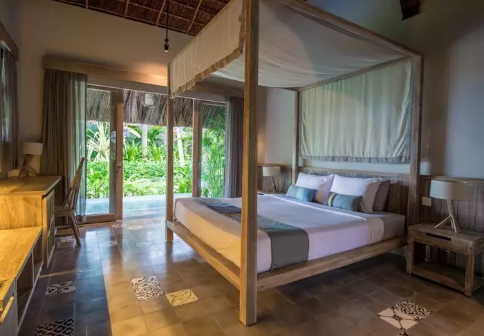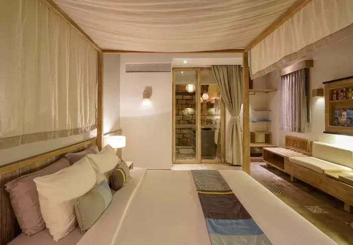 Die Zimmer sind geschmackvoll mit einer Kombination aus Naturfarben mit einzelnen Kontrastfarben auf Polstern, Teppichen usw. eingerichtet. Die Badezimmer besitzen teilweise eine offene Decke, sodass sie die Brise spüren und das Meer riechen. Alle Zimmer sind mit Klimaanlage, Minibar, Tee- und Kaffee-Ecke, Safe, WLAN, Flachbildschirm-TV-Gerät, Moskitonetz und eigener Veranda ausgestattet.