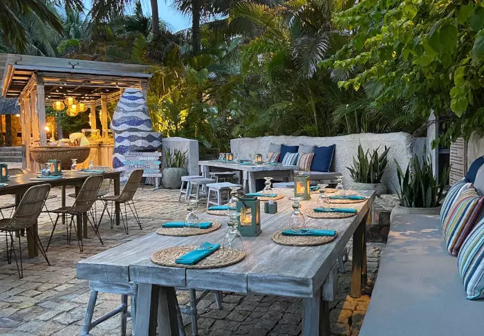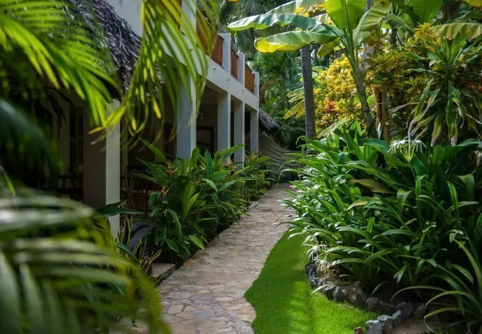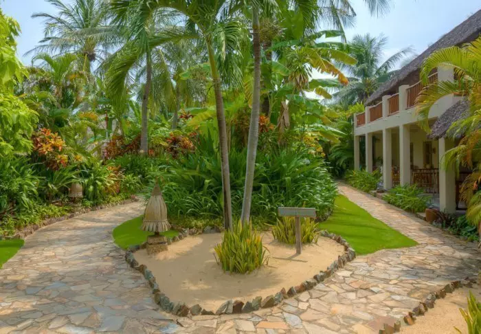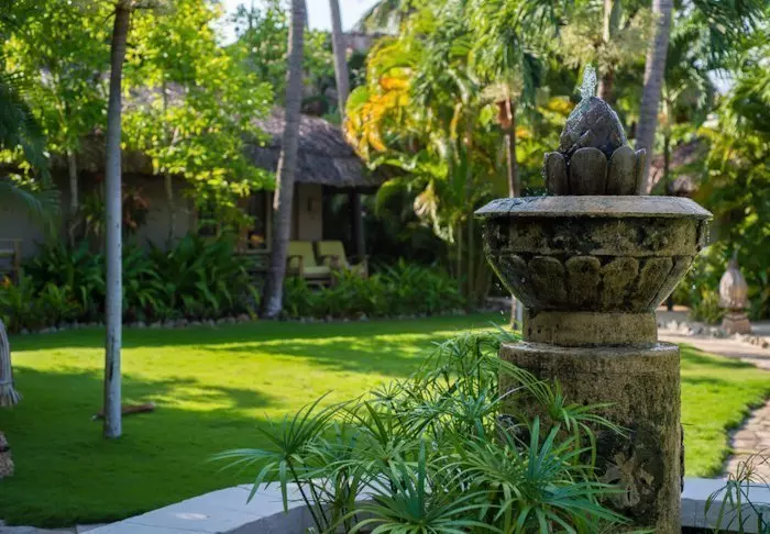 Die 30 Zimmer des Resorts sind im blühenden Garten auf Bungalows aufgeteilt. Das Wasser plätschert, und es gibt bunte Blumen und schattige Plätzchen zum Dösen.
