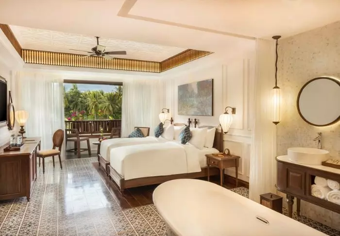 Das Anam bietet 127 besonders stilvoll eingerichtete Zimmer, die Sie in die Vergangenheit zurückführen. Die Zimmer sind mit Fliesen mit wunderschönen Details, Stuckdecken und elegant geschnitzten Holzmöbeln ausgestattet. Sie alle bieten Klimaanlage, WLAN, Minibar, TV-Gerät, Safe, Tee- und Kaffee-Ecke sowie ein Badezimmer mit Regendusche, Badewanne, Föhn und diversen Toilettartikeln. Von Ihrem eigenen Balkon aus können Sie Ihren Nachmittagskaffee genießen, während Sie die Eindrücke des Tages Revue passieren lassen.